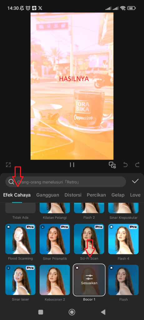 Kamu bisa pilih efek untuk video yang ingin di edit, dengan menggeser dan menemukan katagori “efek cahaya“, silahkan disesuaikan dengan ke inginan kamu.